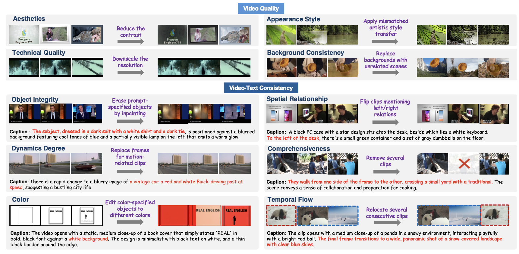 | 7 | Video-Text Consistency | Dynamics Degree | Replace motion-containing clips with static middle frames to reduce dynamics described in the prompt. |
