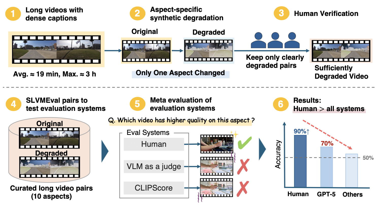 SLVMEval covers 10 evaluation aspects organized into two categories. For each aspect, we construct paired videos by applying a controlled synthetic degradation to the original, keeping all other factors unchanged.